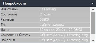 - В поле "Состояние" указывается, загружена или нет внешняя ссылка, а также отображает главный чертеж как "открытый", если он открыт в окне рисования. Если главный чертеж не открыт в окне рисования, состояние остается пустым.