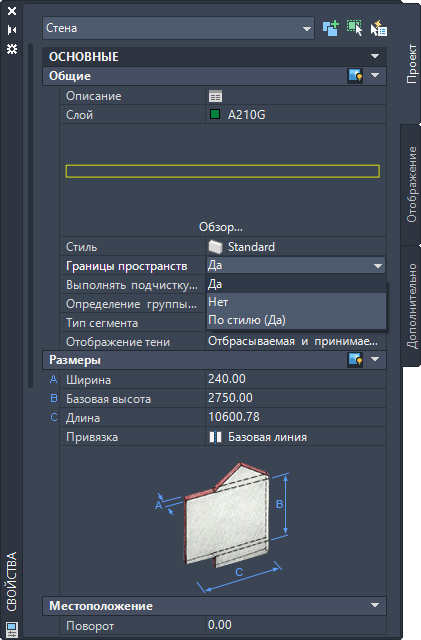 - "По стилю" ("Да" или "Нет"): данный объект использует значение параметра "Границы пространств", заданное в стиле объекта. Это значение используется по умолчанию для объектов, зависящих от стилей.