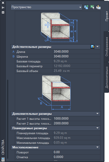 При работе с 3D пространствами произвольной формы имеется возможность рассчитывать их площадь на разных высотах секущих плоскостей. Это удобно для мансардных пространств, различная высота которых рассчитывается по-разному.