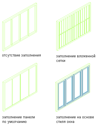 Заполнение определяет содержимое ячейки оконной/дверной сборки. Ячейка оконной/дверной сборки может содержать обычную панель по умолчанию или вложенную сетку, AD-полигон, стеновую панель, стиль двери или окна. Для добавления к определению заполнения стилей объектов, используемых в заполнении, они должны находиться в текущем чертеже. Панели, как правило, представляют собой остекление или другое плоское заполнение, такое как камень или бетон.