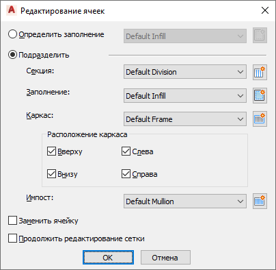 | выбрать определение импоста для сетки, созданное после разделения ячейки, | выберите определение импоста. |