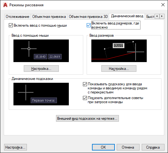 Включает ввод с помощью мыши. Если одновременно включены ввод с помощью мыши и динамический ввода, динамический ввод имеет более высокий приоритет. (системная переменная DYNMODE)
