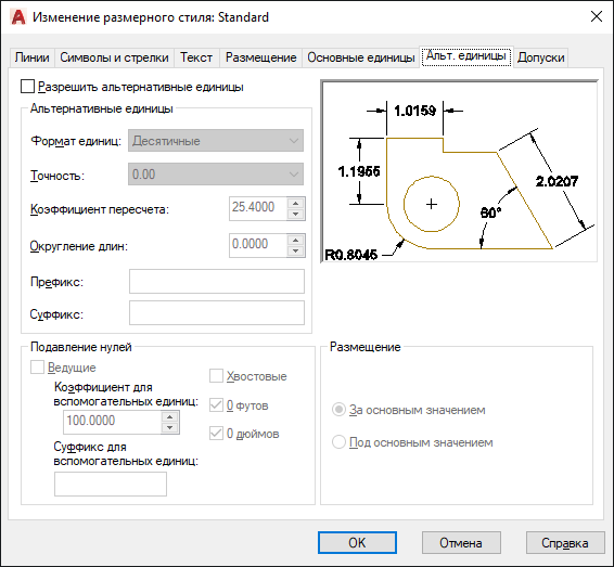 Определение коэффициента пересчета из основных единиц в альтернативные. Например, для преобразования дюймов в миллиметры ввести 25,4. Значение не оказывает влияния на угловые размеры и не применяется для точности округления или положительных и отрицательных допусков. (системная переменная DIMALTF)
