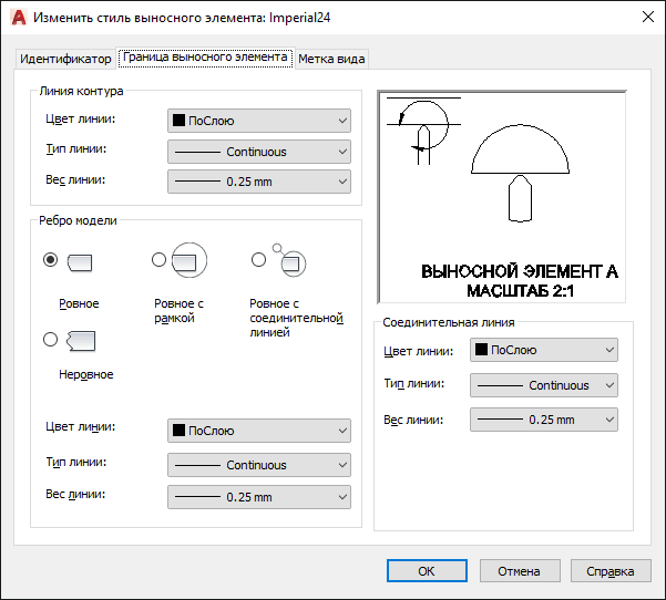 Определение свойств линии границы выносного элемента, ребра модели и соединительной линии выносных элементов.