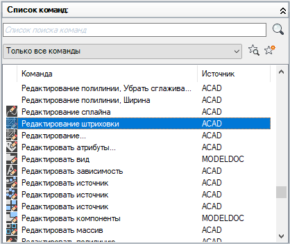 В верхней части панели "Список команд" находится поле "Список поиска команд", с помощью которого можно фильтровать список команд по введенной текстовой строке. Команда отображается в поле списка команд в том случае, если какой-либо фрагмент этой команды совпадает с введенной строкой.