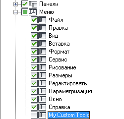- На панели "Адаптации <имя файла>" разверните узел дерева "Панели инструментов", щелкнув знак "плюс" (+) рядом с этим узлом.