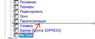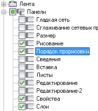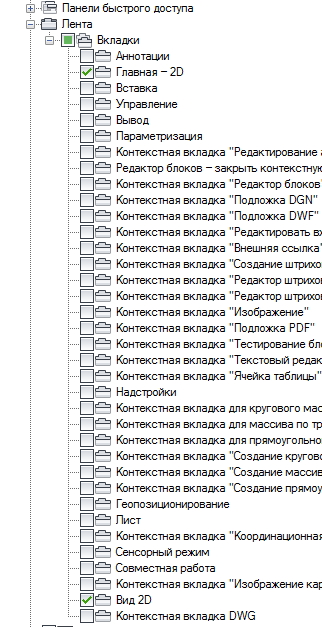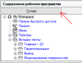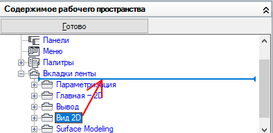 - На панели "Компоненты рабочего пространства" щелкните на значке "плюс" (+) рядом с узлом "Вкладки ленты", чтобы развернуть его.