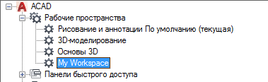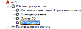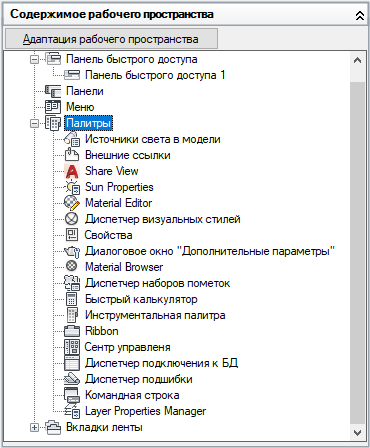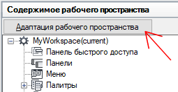 - На вкладке "Адаптация" разверните на панели "Адаптации <имя файла>" узел "Рабочие пространства", щелкнув на знаке "плюс" (+) рядом с этим узлом.