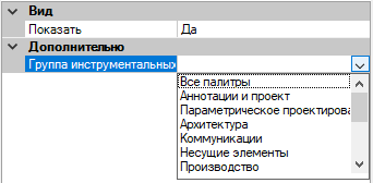 - В поле "Группа инструментальных палитр" выберите одну из групп инструментальных палитр в списке, чтобы связать ее с вкладкой ленты.