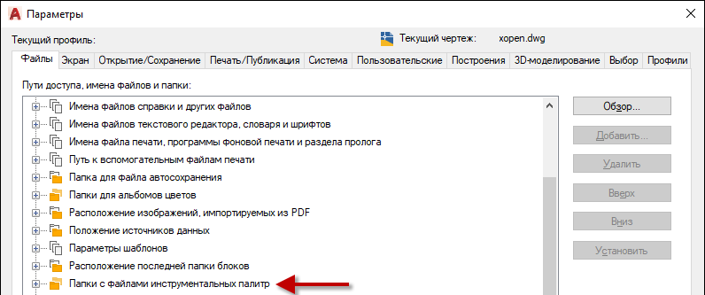 Файлы инструментальных палитр содержат стандартные и пользовательские инструменты. Файлы сохраняются в директориях, указанных в параметре "Местонахождение файлов инструментальных палитр".