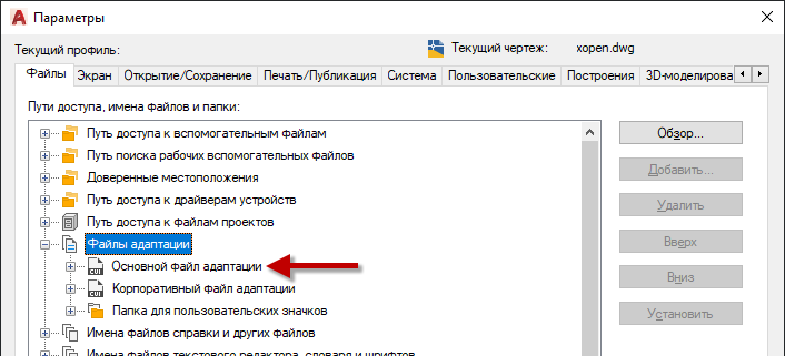 Файлы адаптации (CUI/CUIx) определяют такие элементы интерфейса пользователя, как панели быстрого доступа (ПБД), панели и вкладки ленты, палитры, "классические" панели инструментов и раскрывающиеся меню. На основе предыдущей версии, из которой выполняется перенос, утилита "Перенос пользовательских настроек" выполняет поиск файлов НПИ или CUIx, заданных в параметре основного файла адаптации. Основной файл адаптации переносится в дополнение к файлам частичной адаптации, загруженным в основной файл CUI/CUIx.