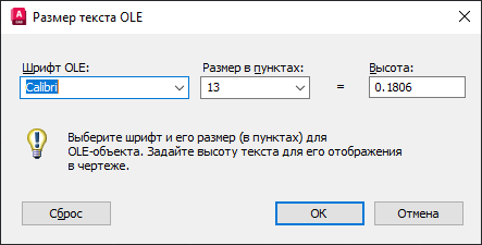 5. В диалоговом окне «Размер текста OLE» для скопированных данных можно указать шрифт OLE, размер точки OLE и высоту текста.