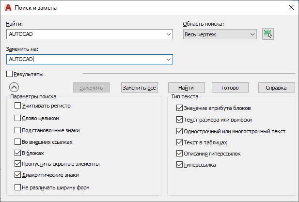 Параметр "Область поиска" определяет, следует ли выполнять поиск и замену текста во всем чертеже или в выбранных объектах.