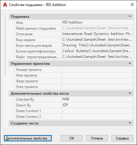 К такой информации относятся путь и имя файла данных подшивки (DST), пути к папкам, содержащим файлы чертежей, относящихся к подшивке, и другие пользовательские свойства подшивки
