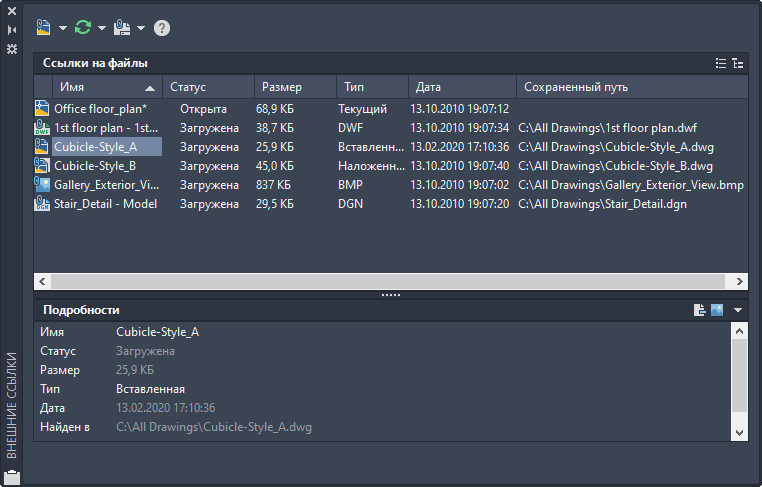 Отображение списка ссылок в текущем чертеже, включая такие сведения, как статус, размер и дата создания.