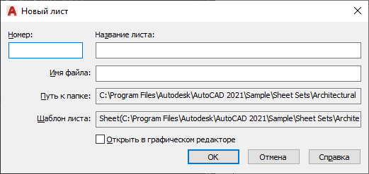 Создание нового листа в текущей подшивке. При этом создается новый файл чертежа (DWG), включающий в себя вкладку-лист с тем же именем, что и сам чертеж.