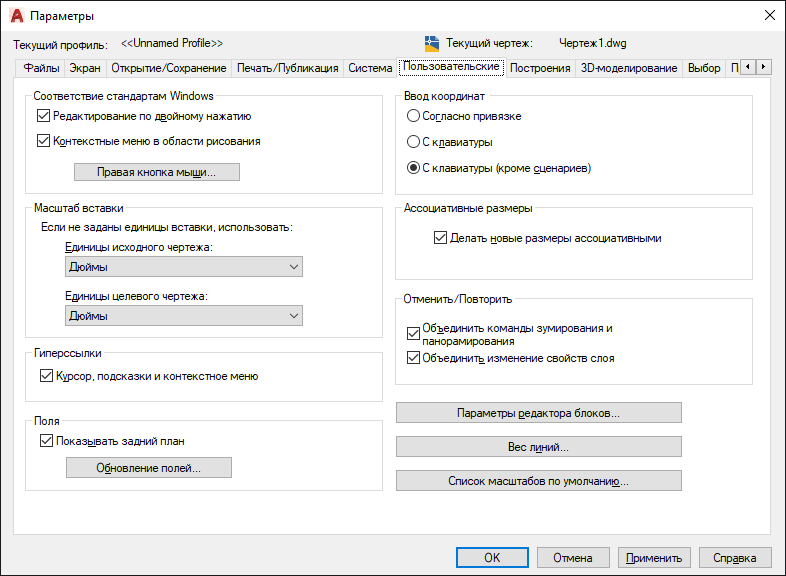 Управляет масштабом по умолчанию при вставке блоков и чертежей.