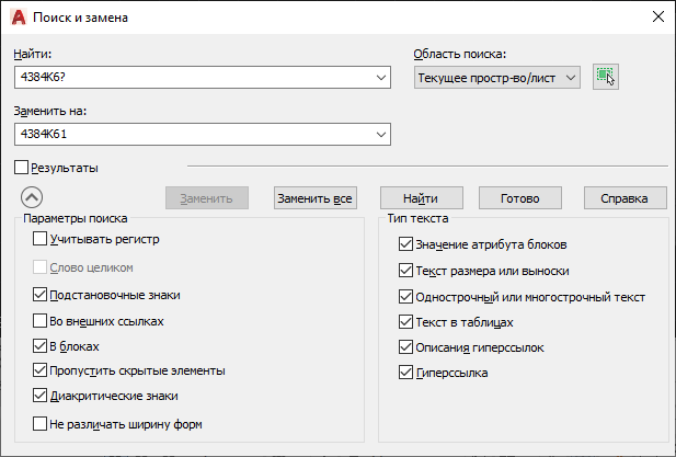 Например, если в чертеже есть несколько похожих фрагментов и все их необходимо заменить на 4384K61, введите 4384K6? в поле «Найти» и 4384K61 в поле «Заменить на».