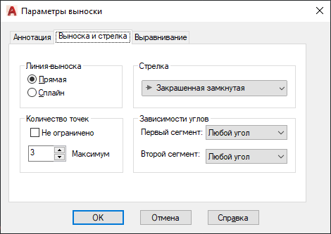 Диалоговое окно "Параметры выноски" состоит из следующих вкладок: "Аннотация", "Линия выноски и стрелка", "Выравнивание".