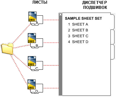 Можно управлять несколькими чертежами в виде подшивок с помощью диспетчера подшивок.
