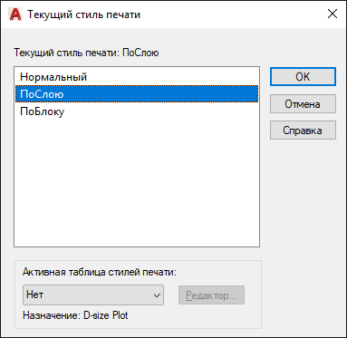 Список стилей печати, доступных для назначения объектам. Среди них стандартный стиль ОБЫЧНЫЙ. Стиль печати представляет собой совокупность переопределений для цвета, размывания, оттенков серого, присвоений перьев, интенсивности, типа и веса линий, торцов и соединений, способа заливки.