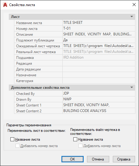 Отображение параметров переименования выбранного листа. Это те же настройки, что и в диалоговом окне "Смена названия и номера листа".