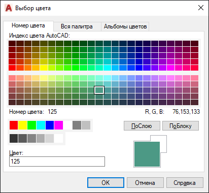 Можно выбрать цвет для элементов окна из 255 цветов, входящих в Индекс цветов AutoCAD (ИЦА), а также из всей палитры или из альбома цветов, используя три предоставленных вкладки.