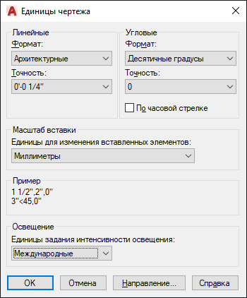 Возможно использование следующих форматов: "Архитектурные", "Десятичные", "Инженерные", "Дробные" и "Научные". Для форматов "Инженерные" и "Архитектурные" линейные величины выражаются в футах и дюймах; при этом единица чертежа соответствует одному дюйму. Остальные форматы могут представлять любые существующие единицы.