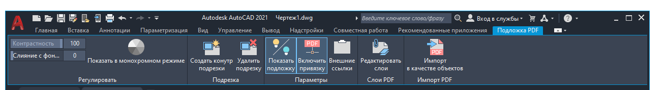 При выборе подложки PDF контекстная вкладка "PDF" отображается на ленте.