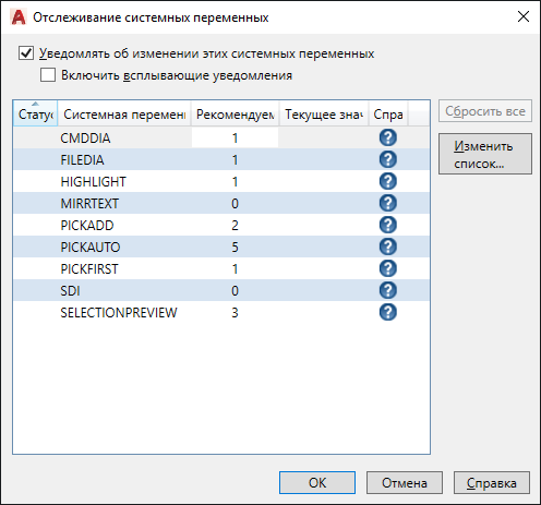 Отображение отслеживаемых системных переменных и их статуса, предполагаемых и текущих значений, а также доступ к отдельной теме справки по системным переменным.