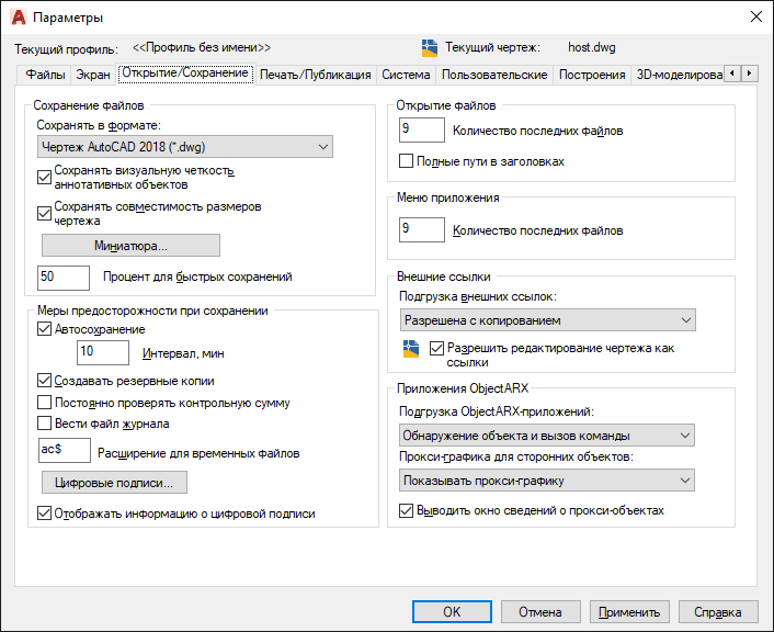 Интервал, мин: При включенной функции автосохранения задает частоту сохранения чертежа. (системная переменная SAVETIME)
