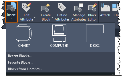 На вкладке «Главная» откройте панель «Блоки» и щелкните «Вставить», чтоб открыть галерею блоков в текущем чертеже, не вызывая палитру блоков. Два других параметра —·«Последние блоки» и «Блоки из библиотек» — открывают палитру блоков на соответствующей вкладке.