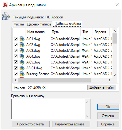 Список файлов, включаемых в упаковку архива, в виде таблицы. По умолчанию сюда заносятся все файлы, на которые ссылается текущий чертеж (такие как внешние ссылки, стили печати и шрифты). Пользователь может добавить файлы в упаковку архива или удалить существующие файлы из него. В архив не включаются файлы, ссылки на которые установлены посредством URL.