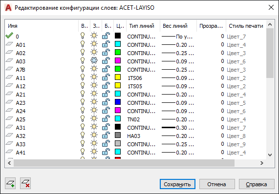 Отображение всех слоев и их свойств, сохраненных в выбранном конфигурации слоев.