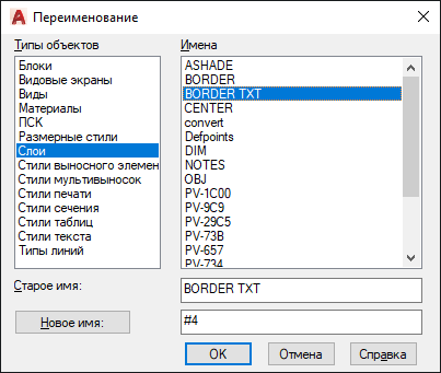 Изменение имен, назначенных таким именованным объектам, как слои и размерные стили.