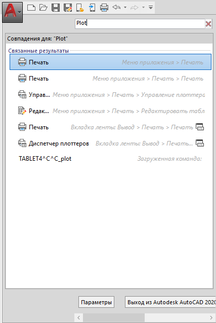 Поле "Поиск команд" отображается в верхней части меню приложения. Результаты поиска могут включать команды меню, основные подсказки и текстовые строки запросов командной строки. Искомые термины можно вводить на любом языке. Результаты применяются к текущему рабочему пространству.