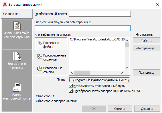 Задание файла или Web-страницы, на которые создается ссылка. Файл может храниться на рабочей станции, на сетевом диске, в Интернете или в корпоративной сети организации.