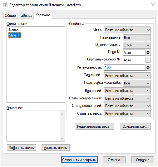 Стили печати отображаются каждый в отдельном столбце, слева направо. Как правило, если количество стилей печати невелико, удобнее пользоваться вкладкой "Таблица". При большом количестве стилей предпочтительнее работать на вкладке "Карточка". На ней все имеющиеся стили перечислены в списке в левой части, а правая часть занята описанием свойств одного выбранного стиля. Стиль NORMAL расположен в начале таблицы именованных стилей печати и является свойством по умолчанию для объектов (стиль печати не назначен). Стиль NORMAL нельзя изменить или удалить.