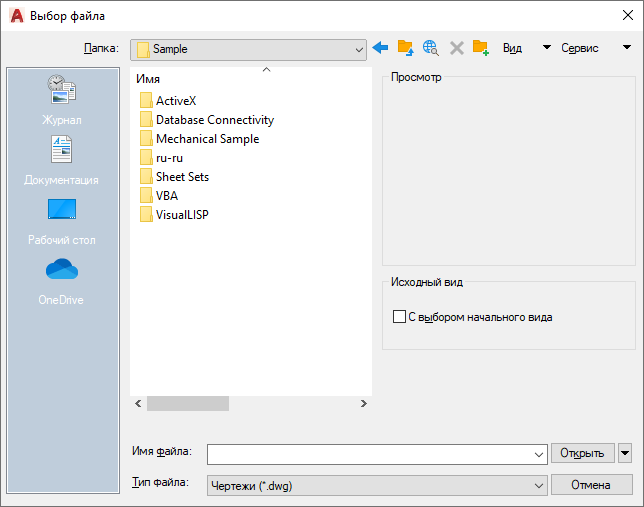 Отображается изображение выбранного файла. Для того чтобы файлы чертежей сохранялись вместе с миниатюрами, необходимо установить флажок "Создавать миниатюру" на вкладке "Открытие/Сохранение" диалогового окна "Параметры".