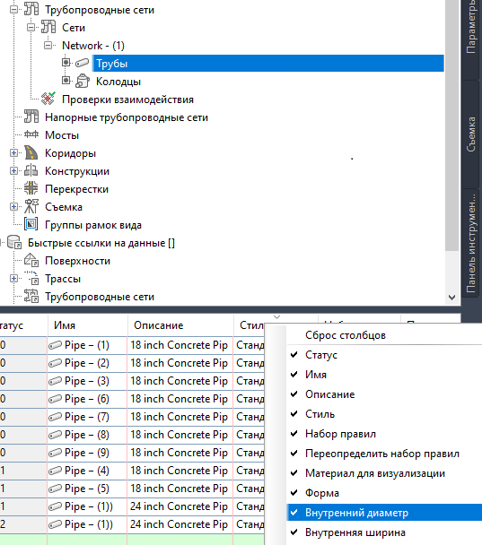 На вкладке "Навигатор" трубопроводной сети можно быстро изменить стили нескольких труб или колодцев, как отображено на рисунке 3.
