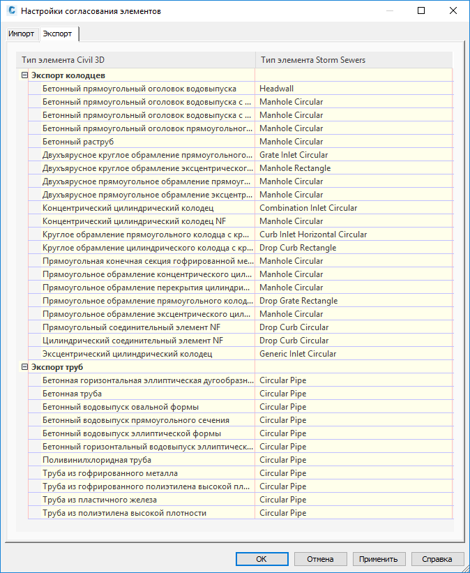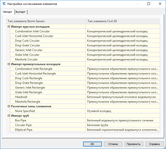 Существуют ограничения в сопоставлении элементов по умолчанию при импорте и экспорте данных из модуля Storm Sewers в Autodesk Civil 3D и обратно в Storm Sewers.