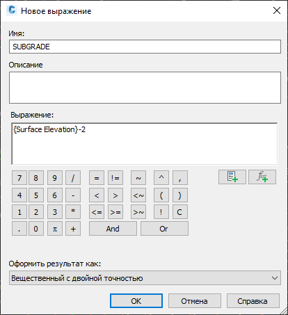 С помощью стилей меток можно создавать и именовать математические выражения на основе характеристик маркируемых объектов. Например, можно создать выражение, в котором отметки в точках поверхности определяются как разность действительных значений отметок поверхности и заданного значения. Такое выражение может иметь название "ОСНОВАНИЕ" и выглядеть следующим образом: {отметка поверхности}-2, где "Отметка поверхности" - это характеристика, или именованное свойство, данной поверхности.