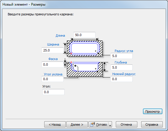 - Радиус угла — Введите радиус для всех четырех углов прямоугольного кармана.