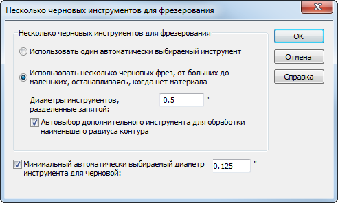Использовать несколько черновых фрез — Эта опция обрабатывает деталь с помощью предоставленного вами списка инструментов. Каждый инструмент режет только в областях, которые не резались ранее. Как только деталь будет обработана полностью, не останется операций, выполняемых более маленькими инструментами. Это хорошая опция для выбора, если в вашей детали есть острые углы, но знайте, что деталь потребует больше инструментов и смен инструмента. Вы должны ввести диаметры инструментов, которые вы хотите использовать. Отделяйте каждый диаметр запятой. В качестве компонента этой опции вы можете выбрать Автовыбор дополнительного инструмента для обработки наименьшего радиуса контура. При выборе этого параметра необходимо указать несколько диаметров большего размера для нескольких черновых проходов, а затем позволить FeatureCAM выбрать инструмент для финального чернового прохода.