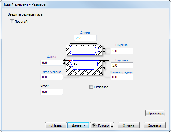 - Выберите Паз и нажмите Далее, чтобы открыть страницу Новый элемент - Размеры.