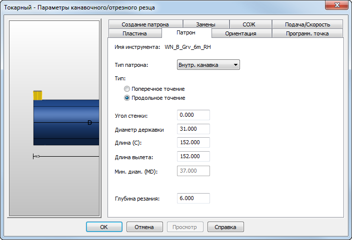 Вкладка Патрон для Канавочно/отрезных резцов содержит следующие атрибуты: