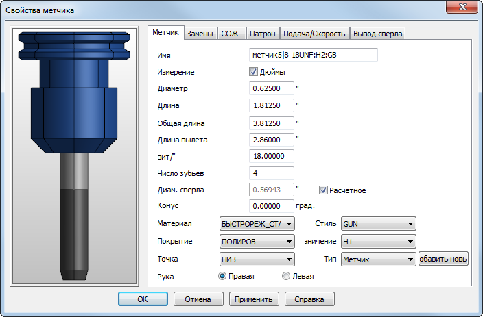 Если не задан Диаметр сверла для винтовой головки или пользовательского типа инструмента, то для вычисления диаметра сверла берется формула для типа Метчик.