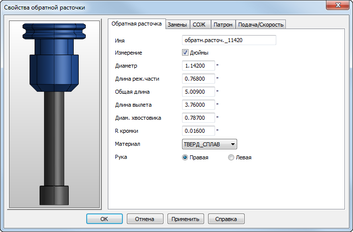 Материал инструмента — указание материала инструмента. Эта информация важна при вычислении подач и скоростей.