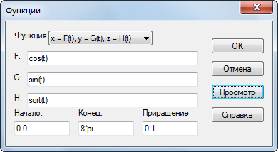 В списке Функция выберите x = F(t), y = G(t), z = H(t).