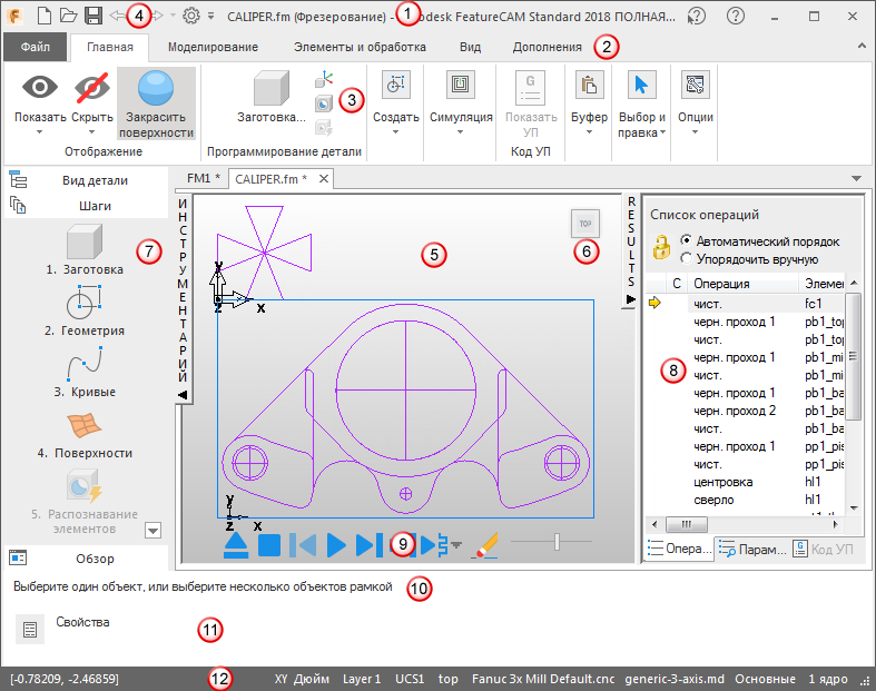 Интерфейс FeatureCAM содержит множество традиционных элементов Windows, таких как панели инструментов, диалоговые окна, контекстные меню и мастеры.